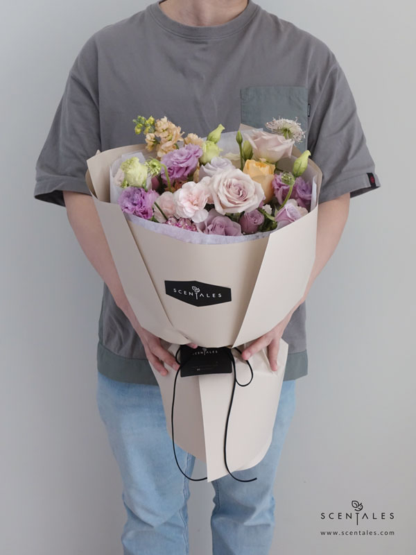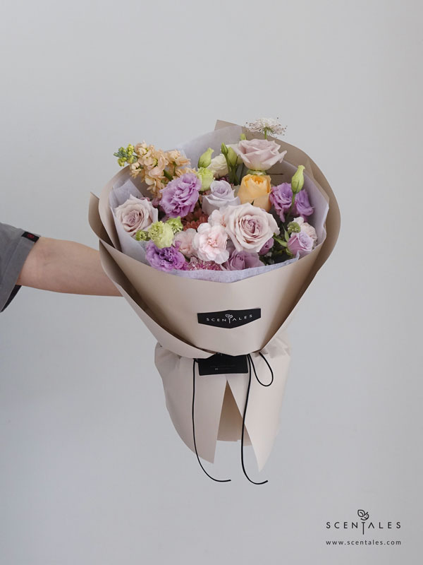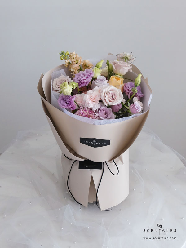Manta rose x3, lilac rose x2, champagne rose x1, light purple spray rose x2, white purple line carnation x2, lilac curly eustoma x2, white eustoma x1, light pink spray carnation x1, smokey rossi pompom x2, white trachymene x1, champagne matthiola x1 and plenty of white baby breath