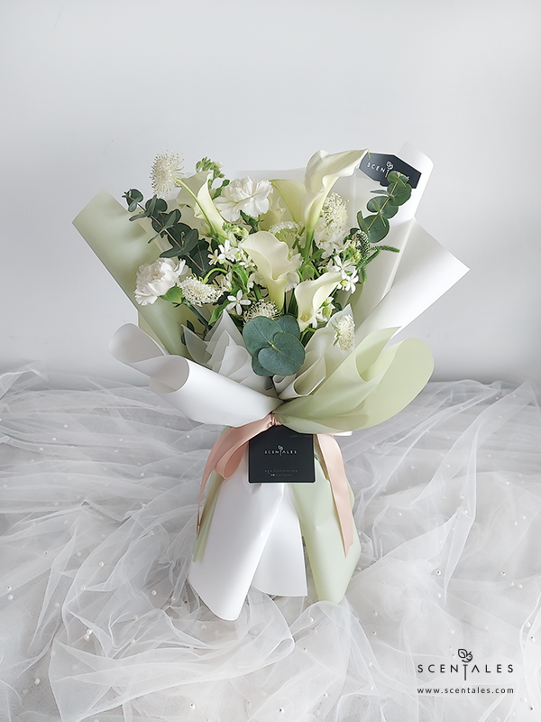 Calla lily x6, white carnation x4, white oxypetalum x3, trachymene x5, veronica x1 and plenty of eucalyptus